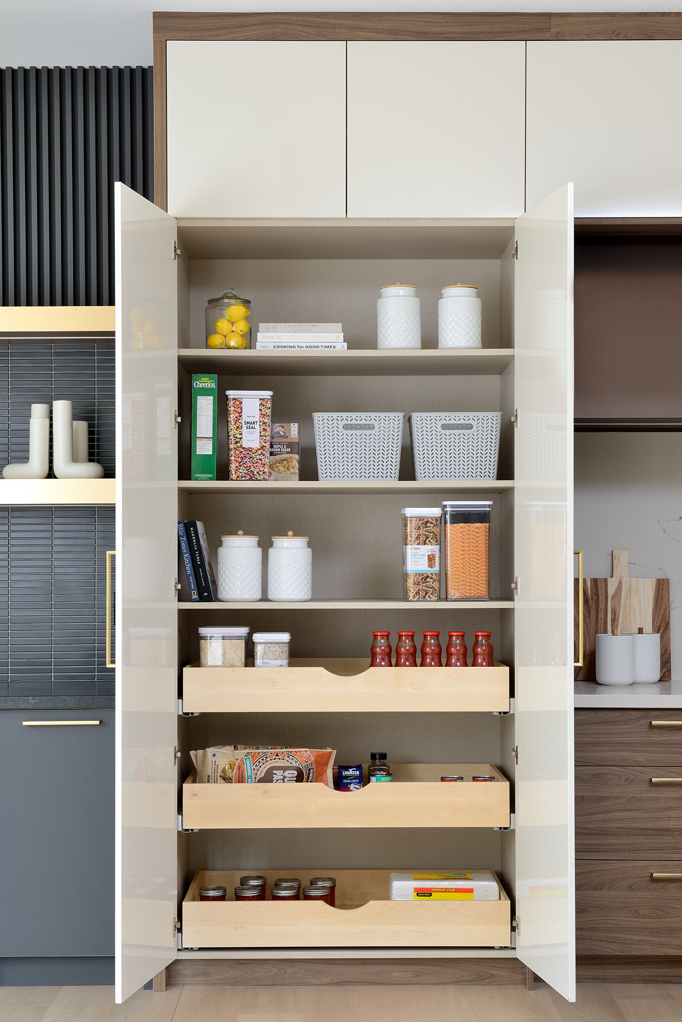 Organizing a pantry efficiently starts with categorizing items based on their type and frequency of use. Dedicated storage like sliding shelves, vertical dividers, and specialized drawers can significantly help this process. A good lighting system is also vital for easy visibility.